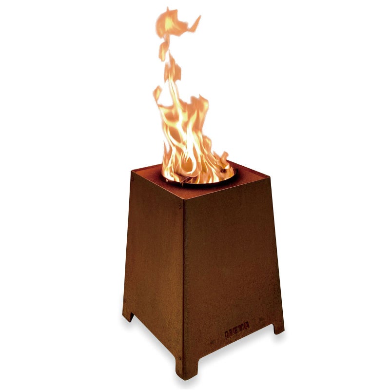 味わい深いサビ色と炎の演出で、庭やデッキのくつろぎスペースの雰囲気づくりに最適です。