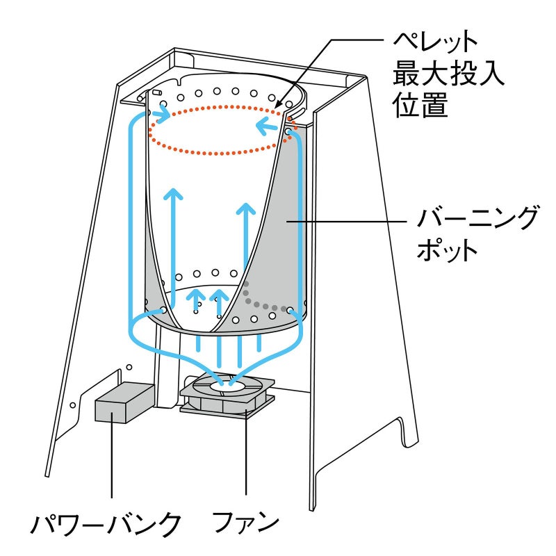 ファンが回ることでバーニングポットの底面と側面から燃焼用の空気がコンスタントに供給され、安定した燃焼が得られます。