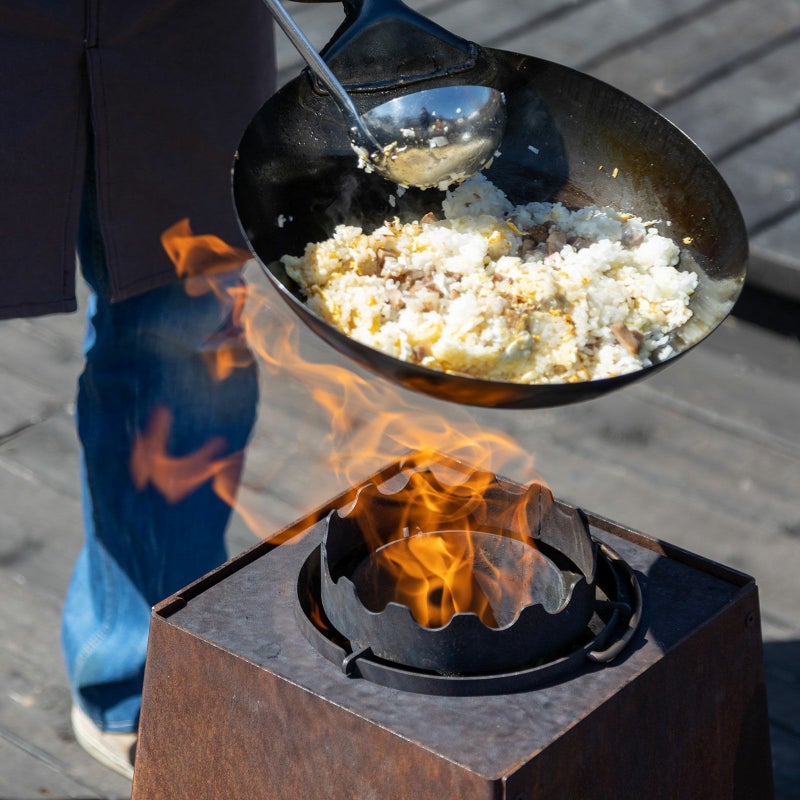 ゆらめく炎を眺めながらのんびりするもよし、調理を楽しむもよし。いろいろに遊べるペレットバーナーです。