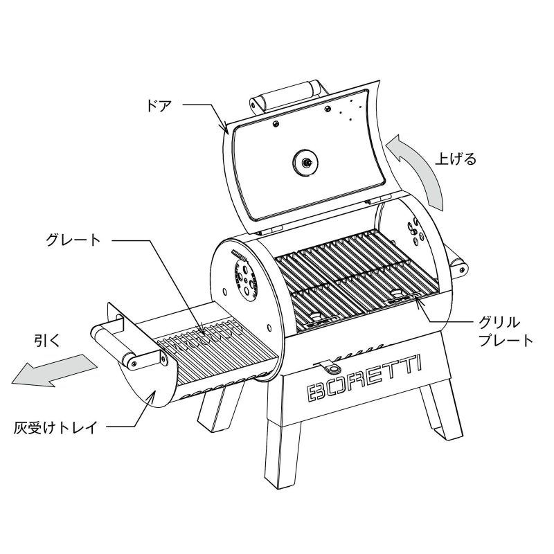 本体サイズ:W57×D39×H52cm グリル面:W40×D30cm 重量:15.0kg 材質:【本体】スチール、【グリルプレート】鋳鉄(ホーロー仕上げ) 燃料:炭、ブリケット 組立式 中国製
