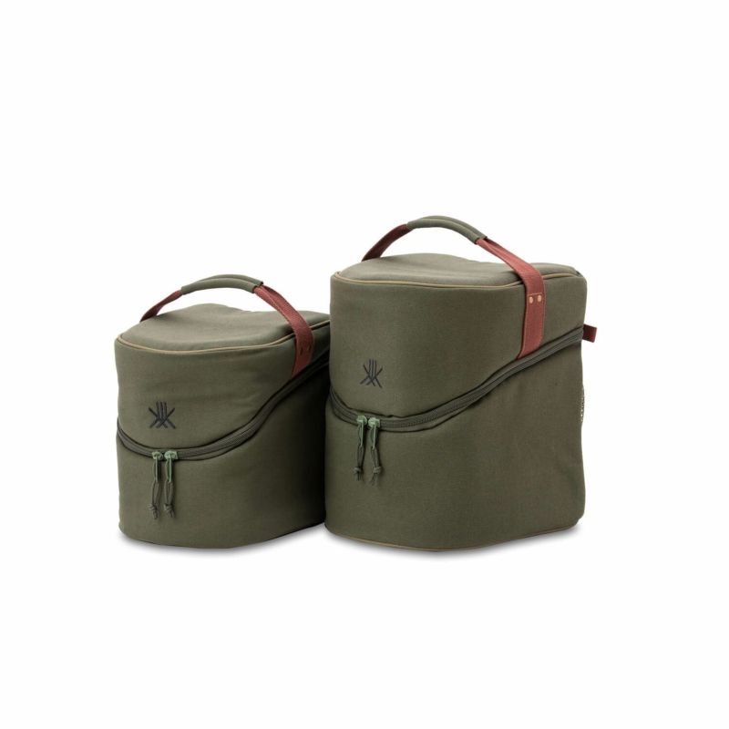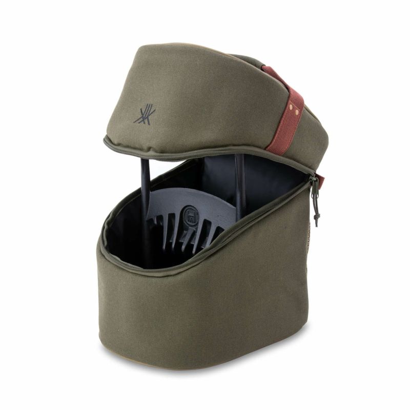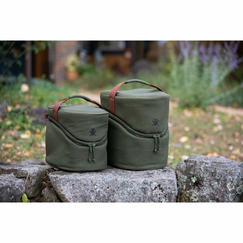外側はカーキ色の丈夫なキャンバス生地、内側はスス汚れが目立ちにくい黒色。内側素材に緩衝材を使用しており、大切な道具を傷付けずに持ち運ぶことができます。 グランマーコッパーケトル(大)、キンドリングクラッカーが収納できるほか、様々なギアの収納にマルチに使用できます。