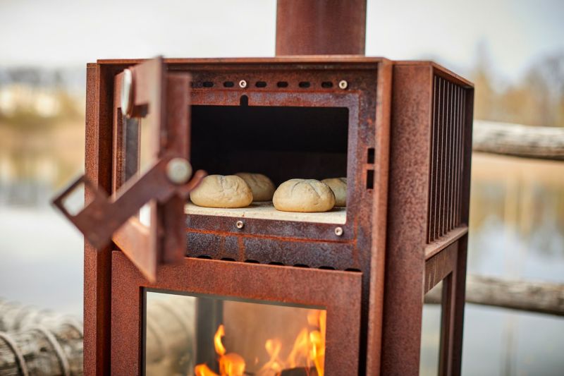 3面ガラスとオーブンを備えたテラスストーブのクエルカスは、6ミリ厚のコールテン鋼を使用し、頑丈で重厚感のある佇まい。