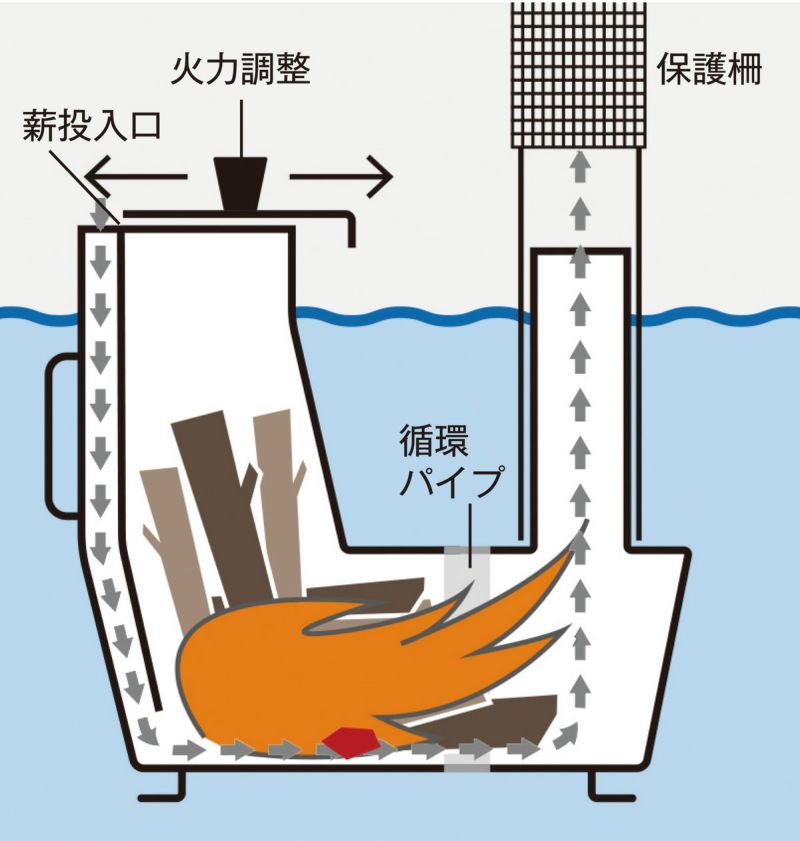 ・ロケットストーブ型水中ボイラーで湯沸かし