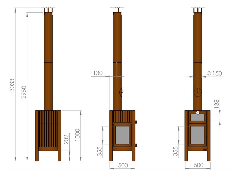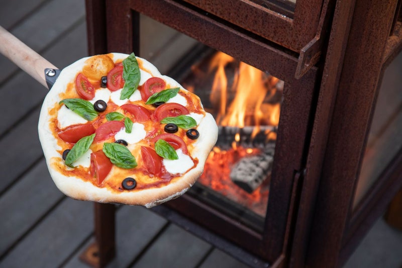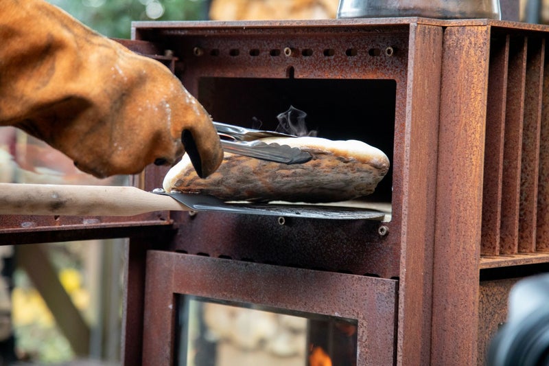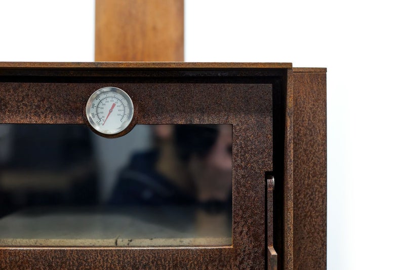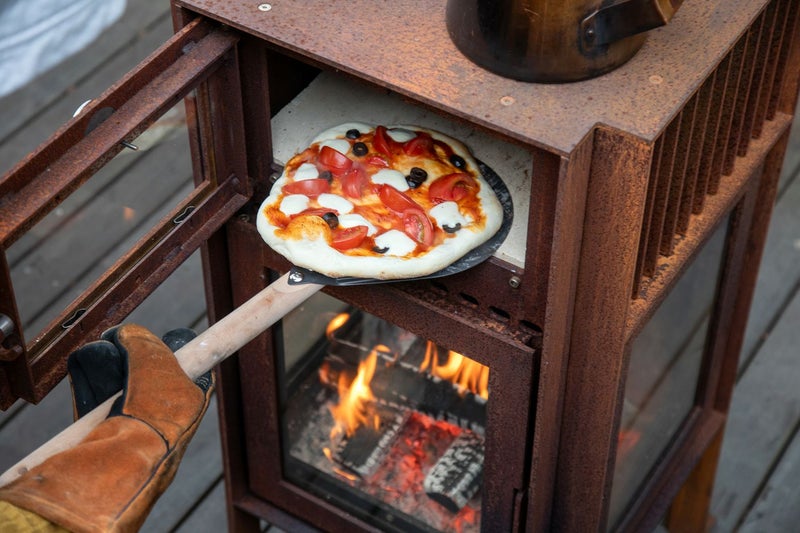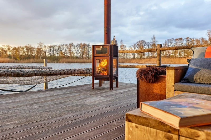 3面ガラスとオーブンを備えたテラスストーブのクエルカスは、6ミリ厚のコールテン鋼を使用し、頑丈で重厚感のある佇まい。