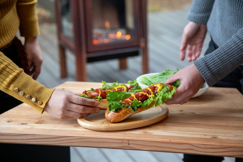 オーブンでトースタしたパンと薪火で香ばしく焼き上げたソーセージで作るホットドッグ。天板で沸かしたお湯で淹れたコーヒーも一緒に。