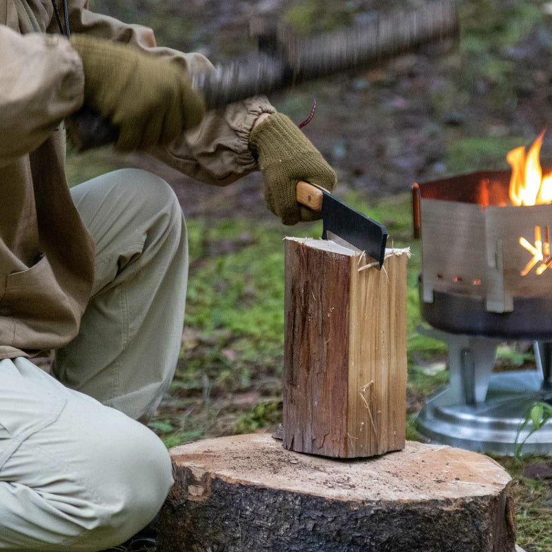 刃の形状は両刃仕様となっており、焚き付け用の薪割作業や細工、バトニングに重宝します。