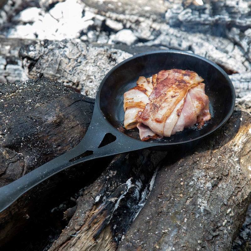 継ぎ目が一切ない1枚物のシームレスフライパンは、存分にたき火を楽しむヘビーユーザーの期待に応えるタフな道具。