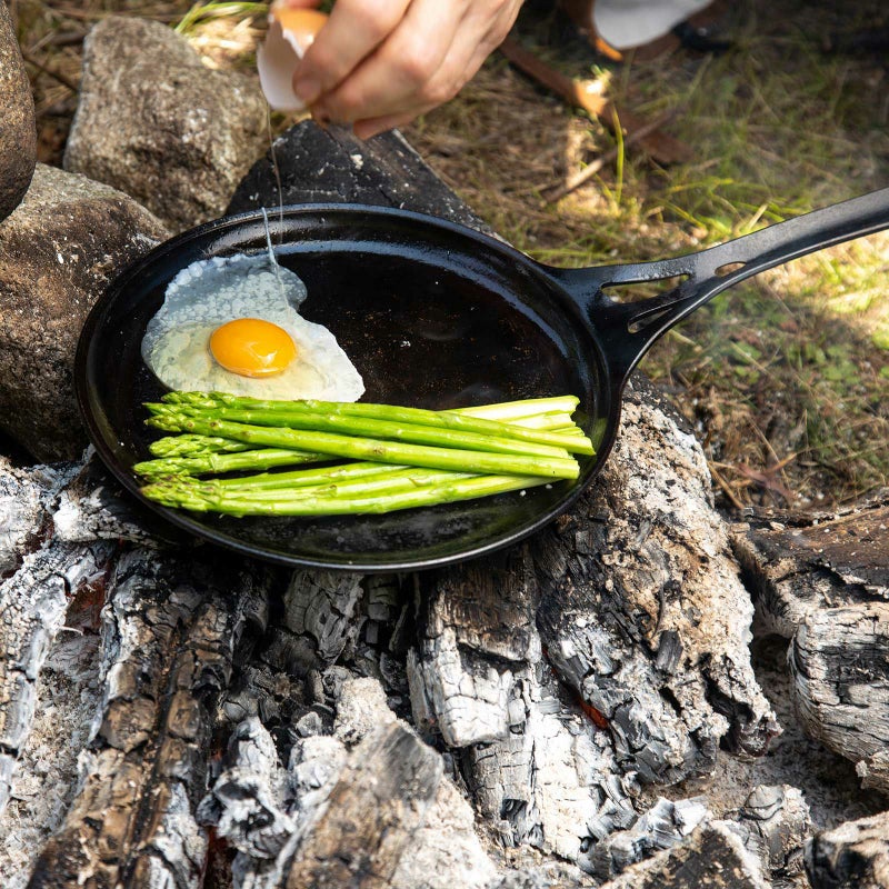 継ぎ目が一切ない1枚物のシームレスフライパンは、存分にたき火を楽しむヘビーユーザーの期待に応えるタフな道具。