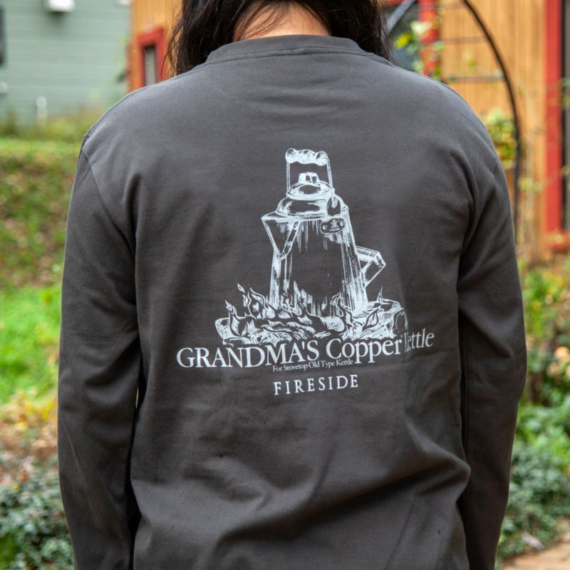 背面にはグランマーコッパーケトル、胸にはケトル開発のきっかけを与えてくれた若き日の「ネルおばあさん」をプリント。