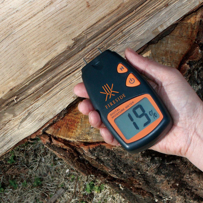 デジタル含水率計を使えば、簡単に薪の乾燥度が測れます。