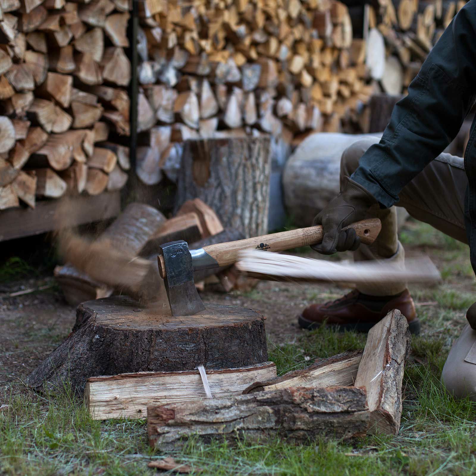 分厚く重い斧身と短い柄がコントロール性を高め、小型薪割りとして焚き付け作りにも重宝します。