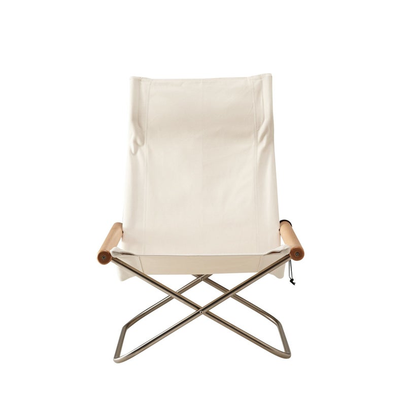 <サイズ> 約幅61×奥行76.5×高さ86cm 座面の高さ:約25.5cm 座面の前縁高さ:約35cm 折りたたみ時:約幅15×奥行76.5×高さ116cm <構造部材> シート:綿 座・背部芯材:金属(鋼) 肘かけ:天然木(ビーチ) 脚部:金属(ステンレス鋼、ヘアライン仕上げ) <表面加工> 座・背部芯材:アクリル樹脂塗装 肘かけ:ウレタン樹脂塗装 <原産国> 日本 <保証書> 3年間品質保証付き ※組立式 ※オットマンは別売りです